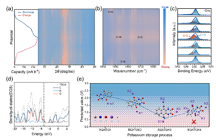 (e) BQXTO钾存储过程模拟及其对应的分子结构演变示意图。
