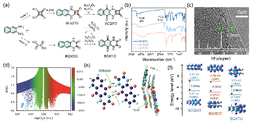 图1. (a) BQXTO样品的合成路线示意图。(b) AQ、BCQDO、BQXDO和BQXTO的FTIR图谱。(c) BQXTO的HRTEM形貌图像及XRD图谱。(d) 约化密度梯度(RDG)与电子密度符号函数sign(λ₂)ρ的散点分布图。(e) 通过量子化学计算获得的氢键(HBs)作用强度及π-π堆积相互作用能数据。(f) AQ、BQXTO、2BQXTO及对比化合物ACTO的分子轨道能级分布:最高占据分子轨道(HOMO)、最低未占分子轨道(LUMO)及能隙(Eg)计算值对比。