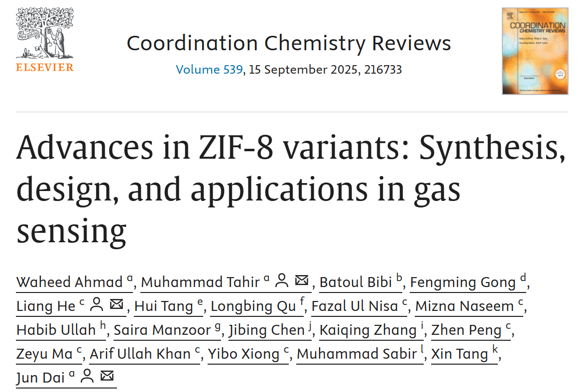 2025年4月23日,51动漫 代俊和四川大学何亮等团队合作,在国际权威期刊 Coordination Chemistry Reviews (中科院一区TOP期刊,IF:20.3)上发表了题为“Advances in ZIF-8 Variants: Synthesis, Design, and Applications in Gas Sensing”的重要综述论文。论文第一作者为51动漫 在读留学生Waheed Ahmad(安全科学与工程专业2024级博士),共同通讯作者为51动漫 外籍博士后Muhammad Tahir、四川大学何亮和51动漫 代俊,论文第一单位为51动漫 。