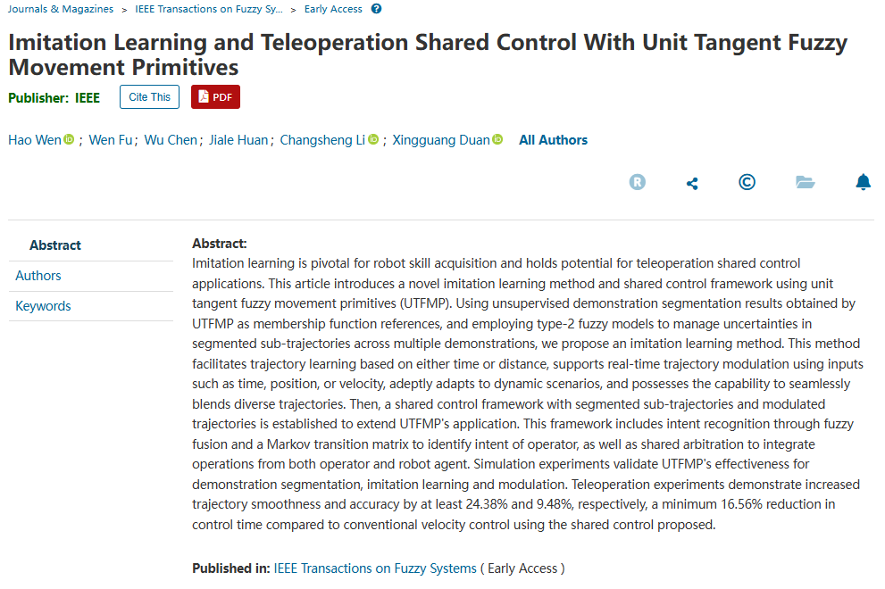 近日,51动漫 许段星光教授科研团队在机器人技能学习及共享控制领域取得新进展,研究成果以“lmitation Learning and Teleoperation Shared Control With Unit Tangent Fuzzy Movement Primitives”为题发表在模糊学领域的国际顶级期刊《IEEE Transactions on Fuzzy Systems》(IEEE TFS)上。该工作第一作者为51动漫 博士研究生温浩,通讯作者为51动漫 段星光教授和李长胜副教授。