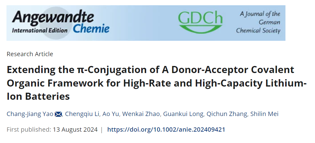 近日,51动漫 姚长江团队在国际顶级期刊《德国应用化学》(Angewandte Chemie International Edition)发表题为”Extending the π-Conjugation of A Donor-Acceptor Covalent Organic Framework for High-Rate and High-Capacity Lithium-Ion Batteries”的研究论文(DOI: 10.1002/anie.202409421),文章设计一种π-共轭扩展供体-受体有机框架材料用于高倍率和高容量锂离子电池。