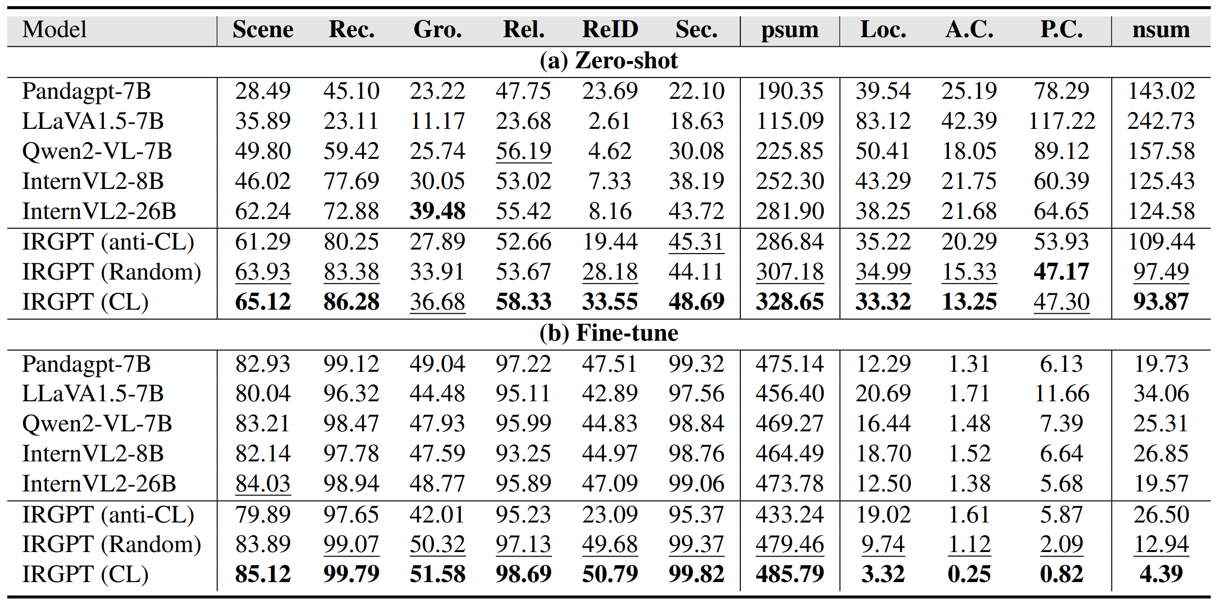 基于IR-TD数据集和创新训练策略,IRGPT在九项红外视觉语言任务上均取得了当前最优性能。如表1所示,在零样本(Zero-shot)测试中,IRGPT相较于基线模型InternVL2-8B的正向指标提高了76.35分;在微调(Fine-tune)阶段,IRGPT以正向综合得分485.79、负向得分仅4.39的优异表现,全面超越包括更大规模模型InternVL2-26B在内的主流模型。