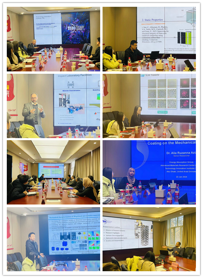 袁梦琦向代表团一行表示欢迎,并简要介绍了学院在人才培养、科学研究及国际合作方面的整体情况。Guan Zhongwei教授对学院的热情欢迎表示感谢,并重点介绍了阿布扎比技术创新研究所的研究领域及近年来的科研成就。会谈中,双方围绕推动建立国际联合实验室、联合开展科研项目等议题交换了意见并达成共识。