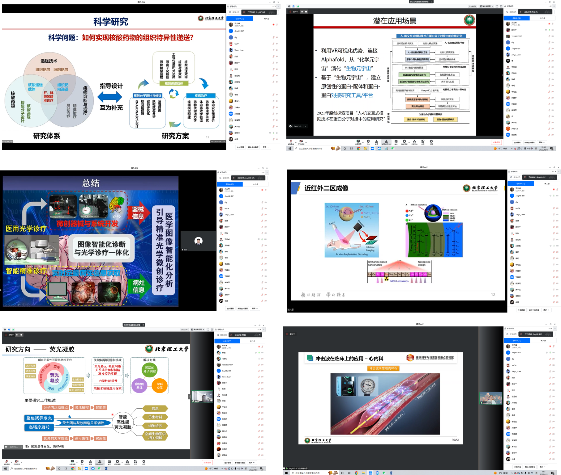 在报告后的自由讨论环节,6位专家学者分别就分子模拟在核酸递送技术中是否有应用场景,智能光学诊疗和稀土近红外光功能纳米材料两个领域中的合作点及应用点,通过分析水凝胶在力学刺激下的响应来拓展在冲击防护中应用的可能性等学科交叉的主题,进行深入交流。
