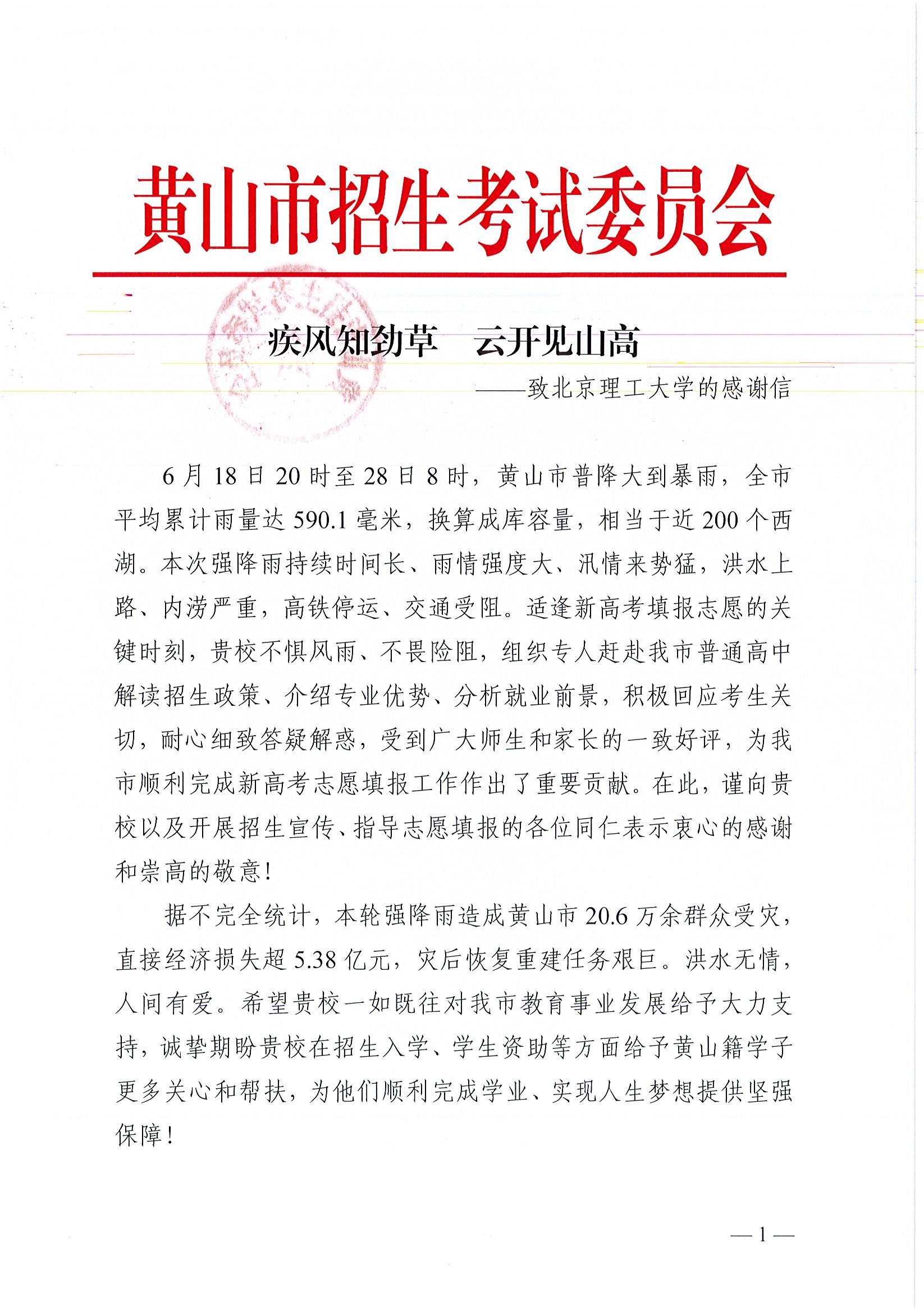 信中指出,6月18日20时至28日8时,黄山市普降大到暴雨。本次强降雨持续时间长、雨情强度大、汛情来势猛,洪水上路、内涝严重,高铁停运、交通受阻。适逢新高考填报志愿的关键时刻,安徽招生组陈慧敏、姚寿文老师不惧风雨、不畏险阻,赶赴黄山市普通高中解读招生政策、介绍专业优势、分析就业前景,积极回应考生关切,耐心细致答疑解惑,受到广大师生和家长的一致好评,为黄山市顺利完成新高考志愿填报工作作出了重要贡献。